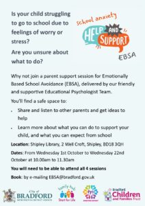 Have your heard of the Emotionally Based School Avoidance (EBSA) support groups led by the friendly and supportive Educational Psychologist Team.