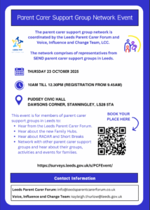 The parent carer support group network is coordinated by the LEEDS PCF and Voice, Influence and Change Team, LCC. The network comprises of representatives from SEND parent carer support groups in Leeds.