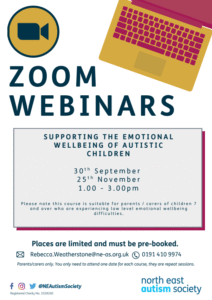 Join the North East Autism Society for a supportive and informative Zoom webinar designed for parents and carers of autistic children and young people aged 7 and above who are experiencing low-level emotional wellbeing difficulties.